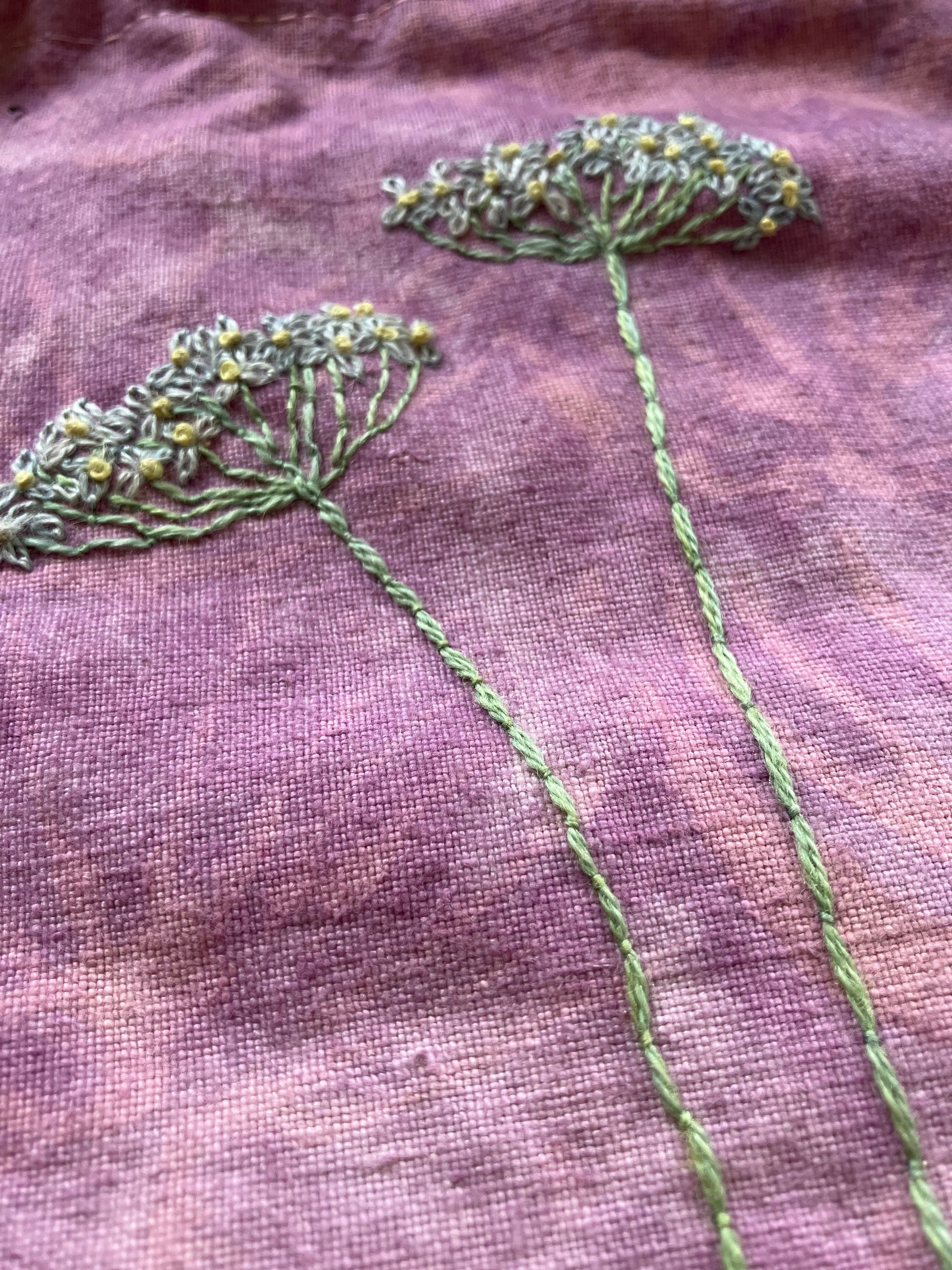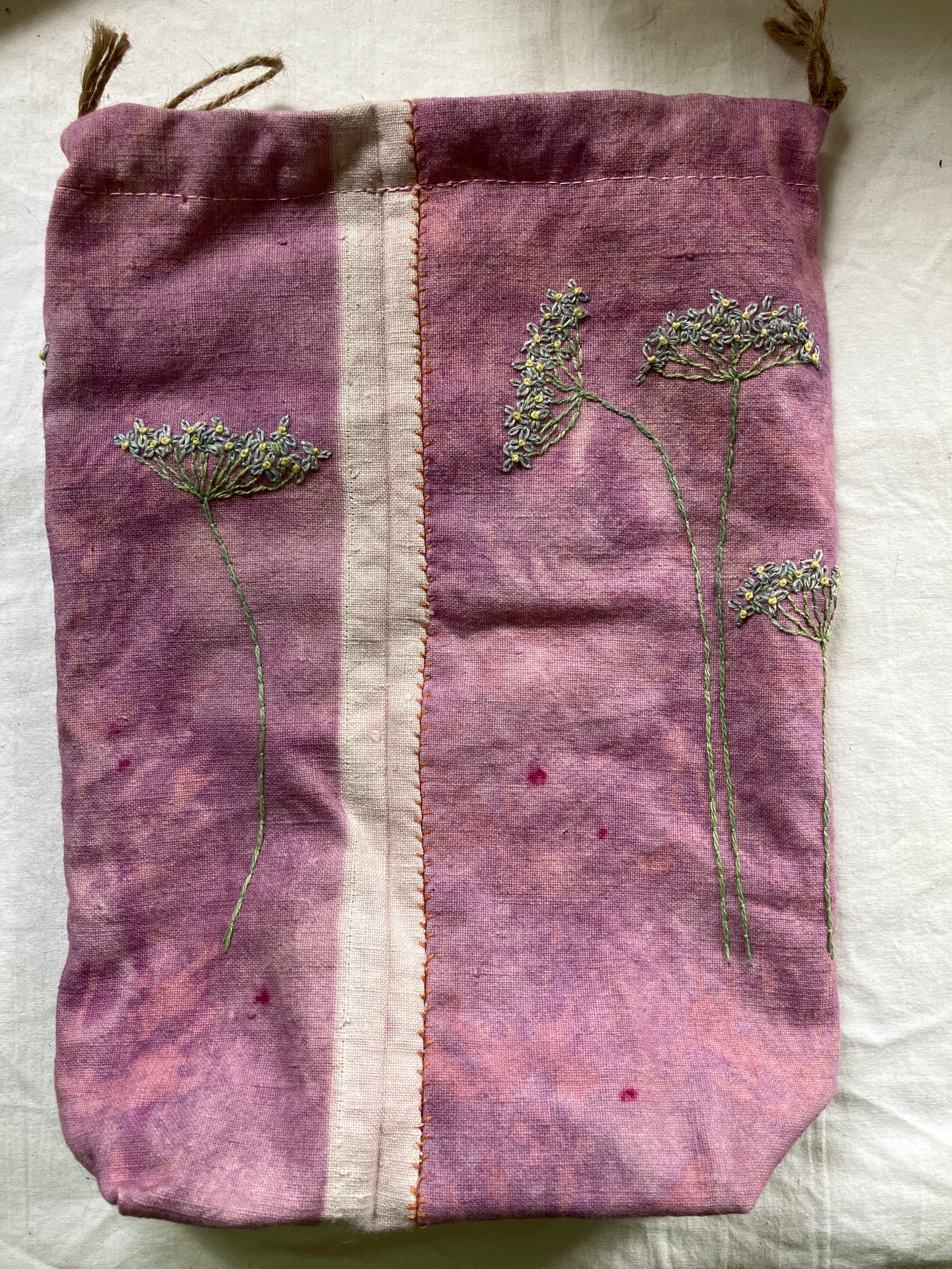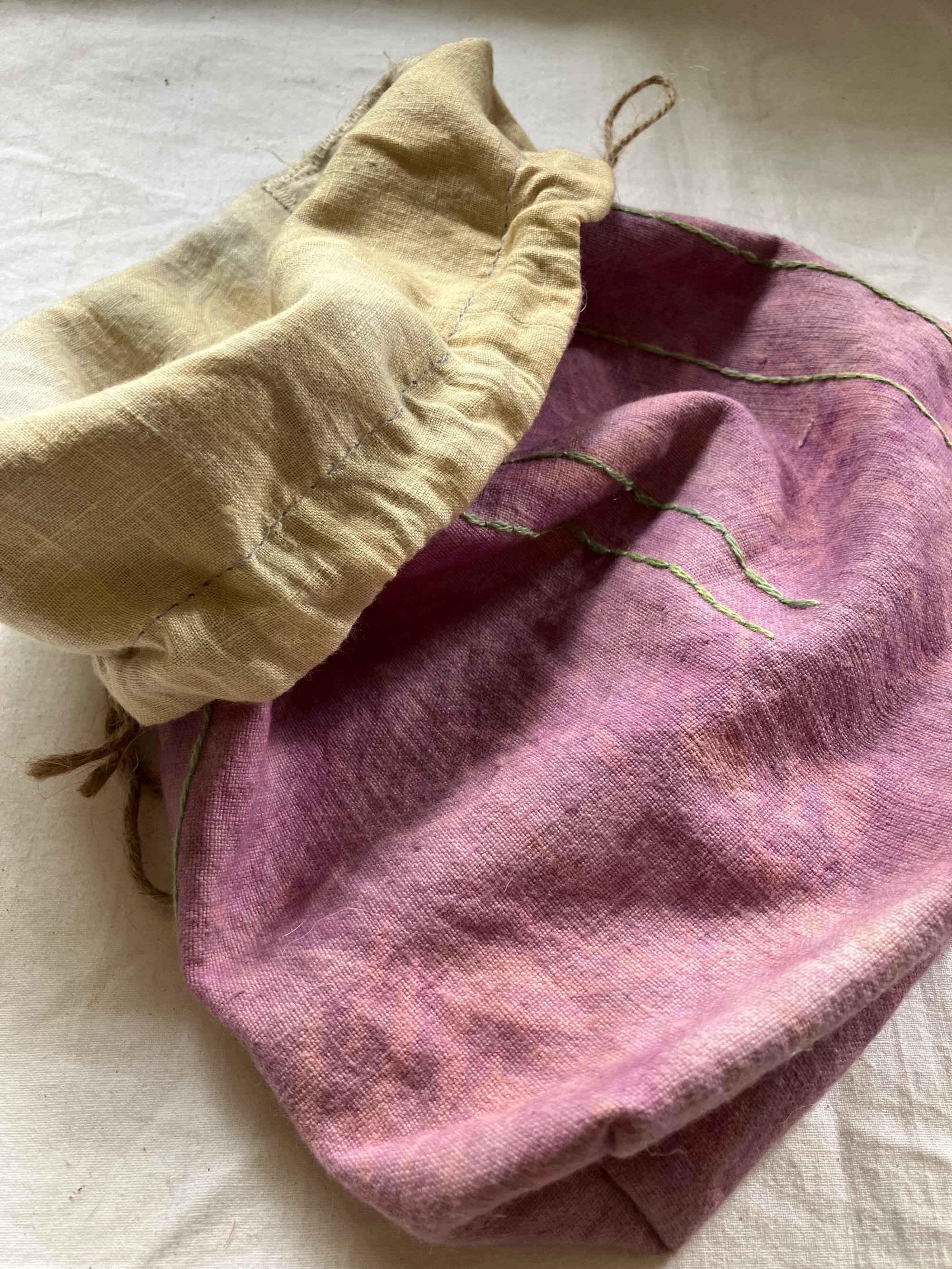 Medium size project bag. All my project bags, sacks and cases etc. are made of reused materials, most of the time clothes from charity shops. This one is made of heavy linen, which is dyed wit cochineal, after unsuccessful printing experiment and is embroidered with threads dyed with natural dyes.