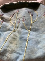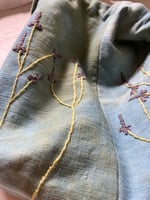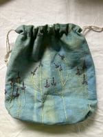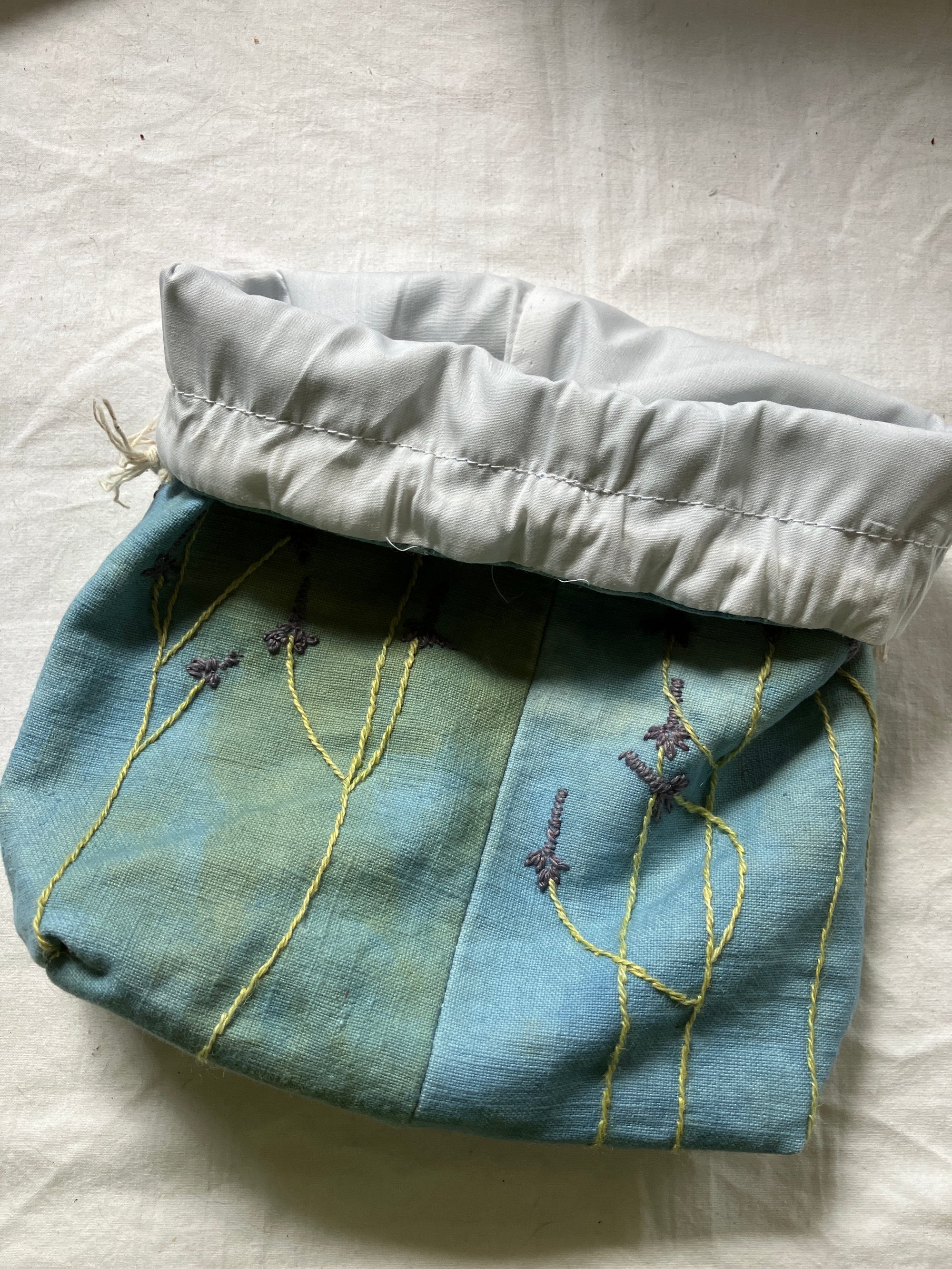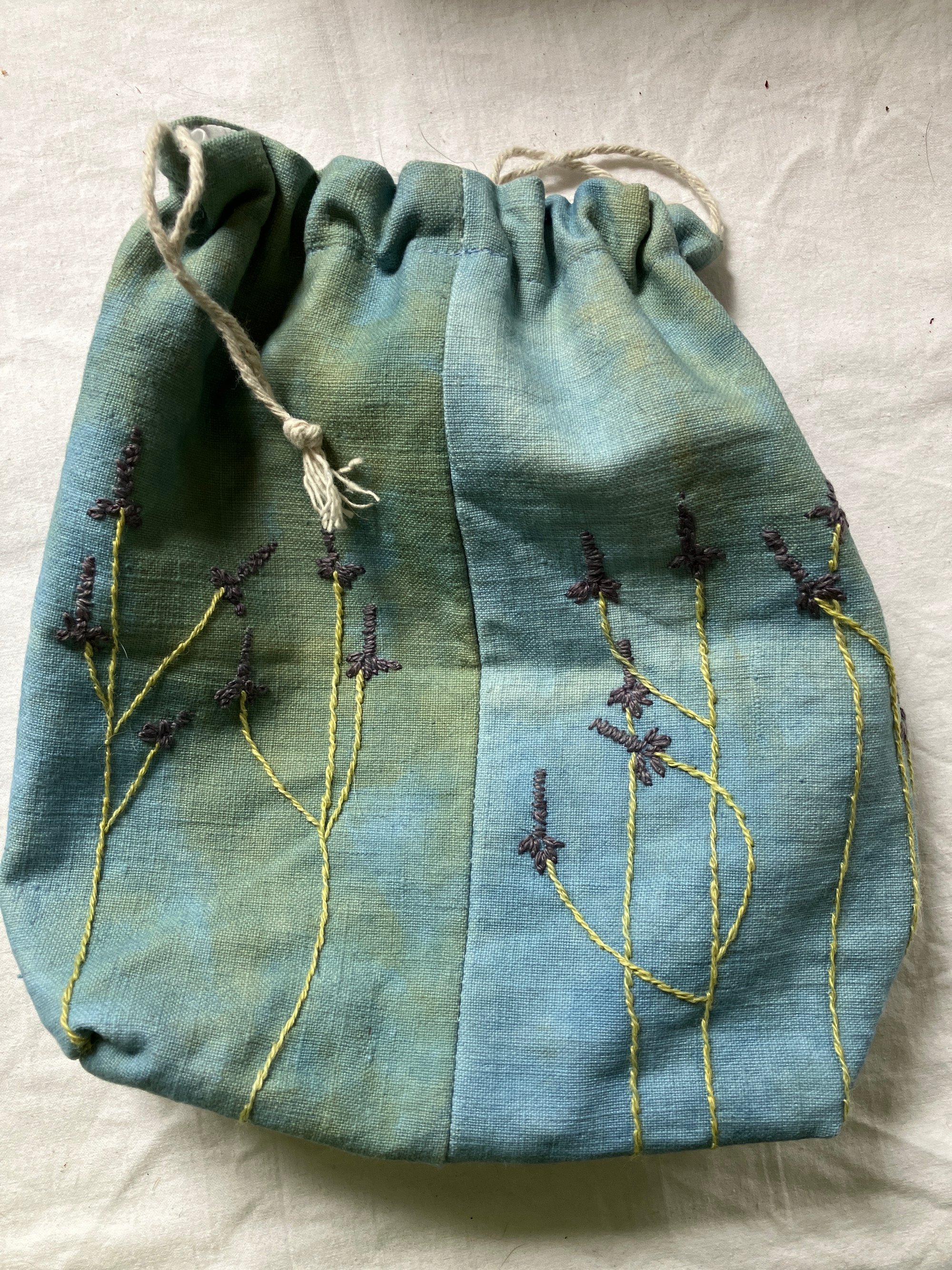 All my project bags, sacks and cases etc. are made of reused materials, most of the time older clothes from charity shops. This one is made of heavy linen fabric, which is overdyed with indigo, it is embroidered with threads dyed with natural dyes.