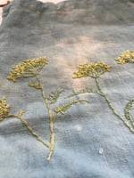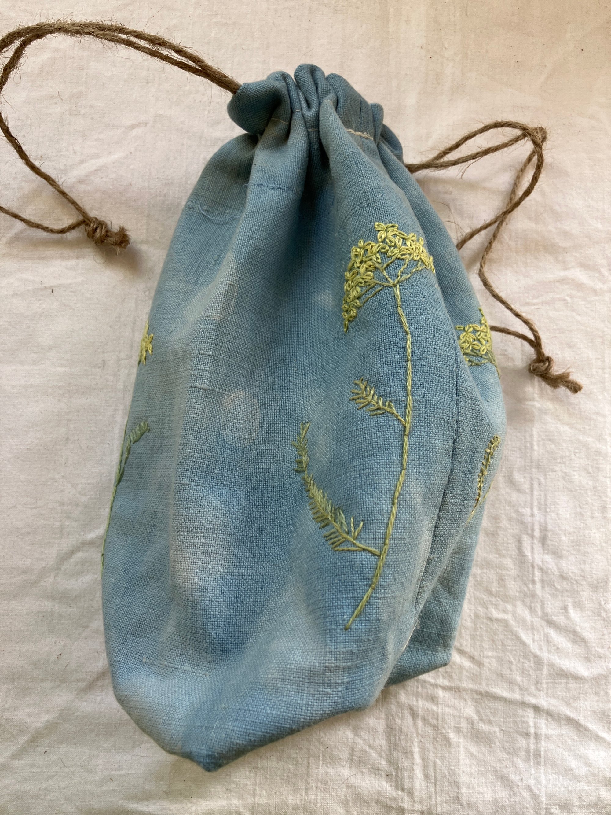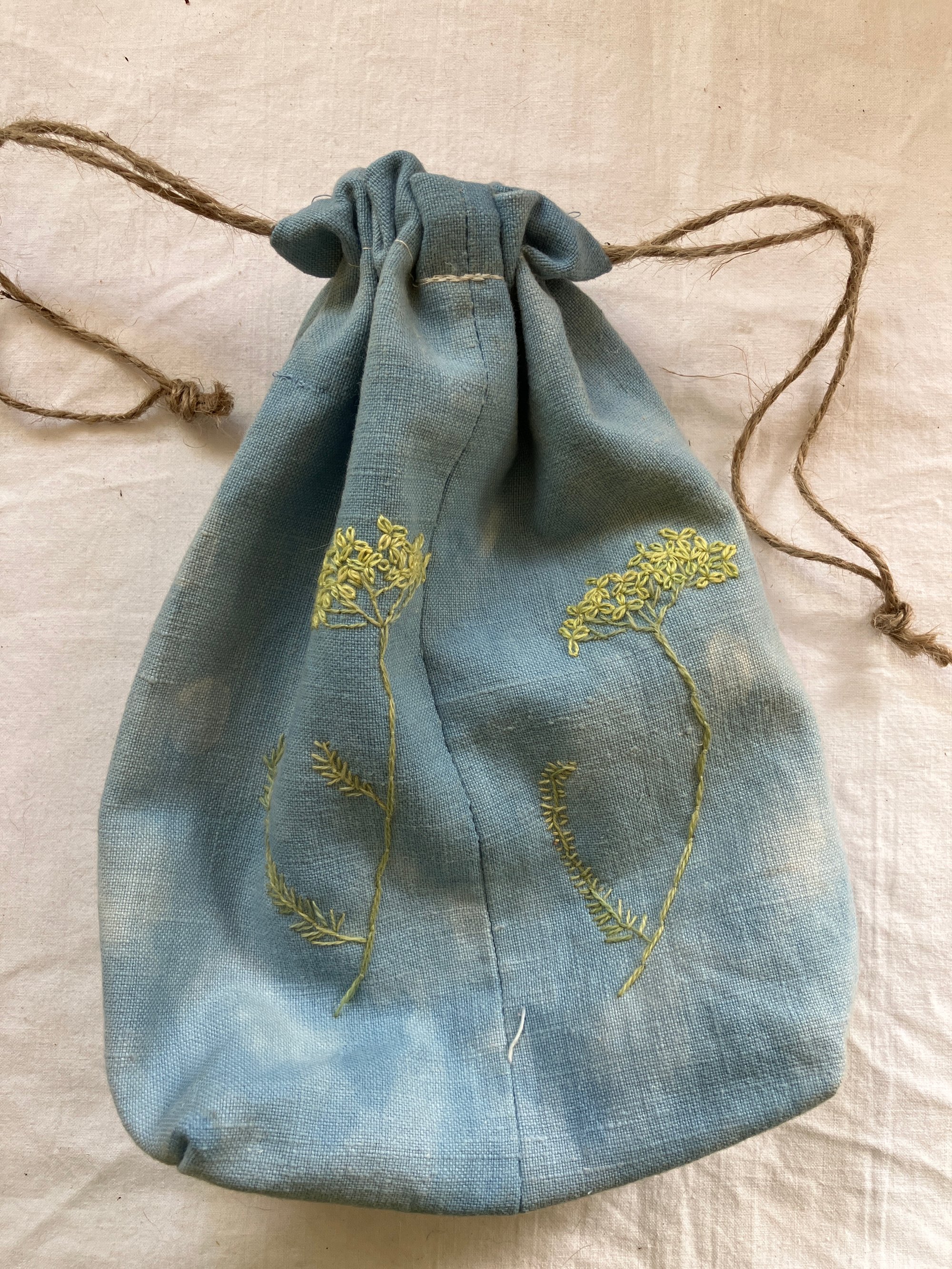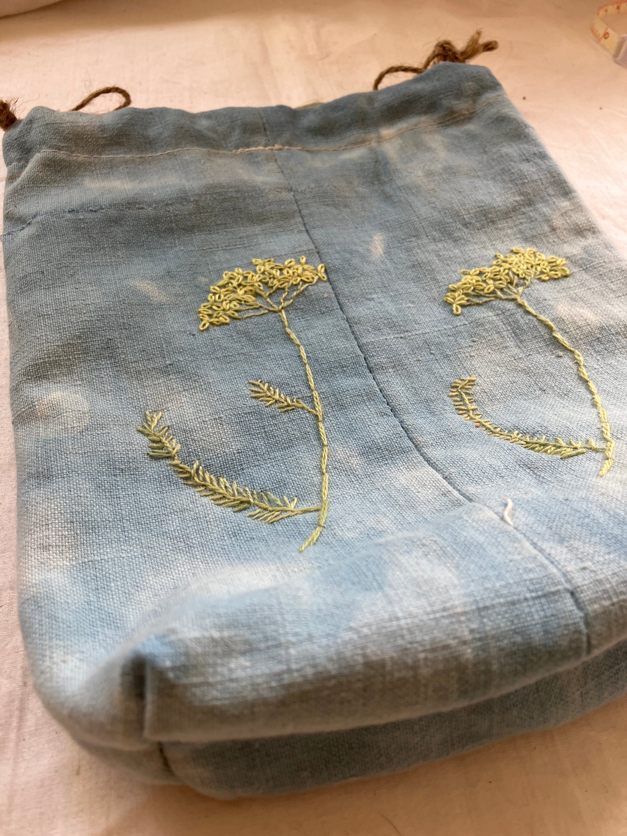 All my project bags, sacks and cases etc. are made of reused materials, most of the time older clothes from charity shops. This one is made of heavy linen fabric, which is overdyed with indigo, it is embroidered with threads dyed with natural dyes.